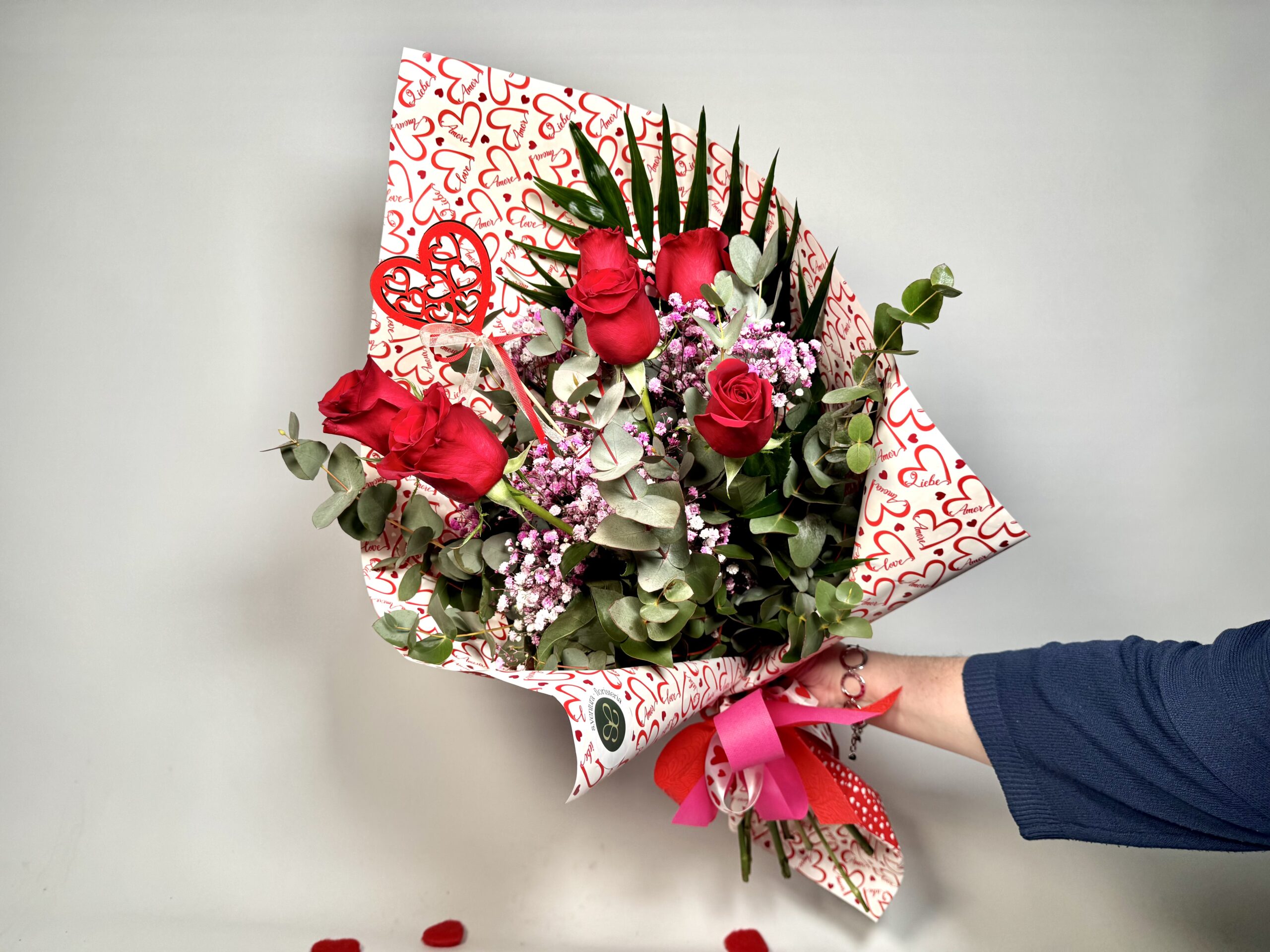 RAMO 6 ROSAS ROJAS FREEDOM CON PANICULATA, EUCALIPTO I ENVOLTORIO Y CORAZON SAN VALENTIN