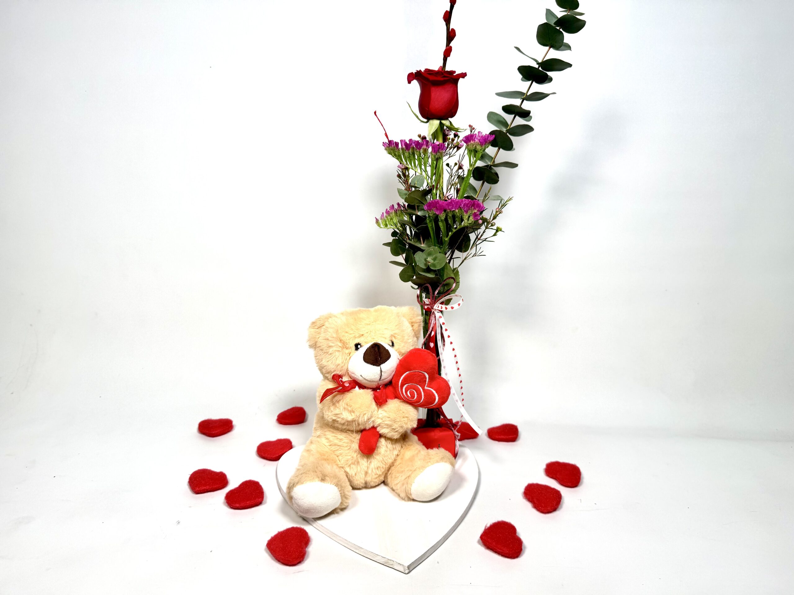 BASE COR FUSTA AMB OSSET PELUIX (23 CM APROX) I ROSA VERMELLA FREEDOM, FLOR DE CERA I EUCALIPTO